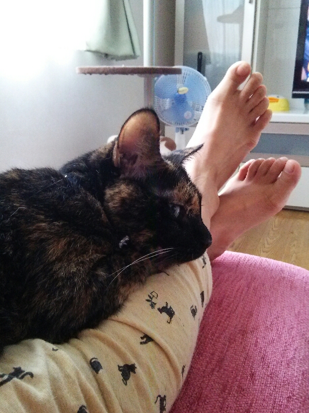 「早く座って! ちゃちゃが膝上で寝たいから」